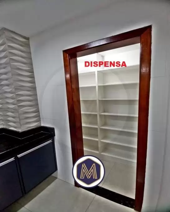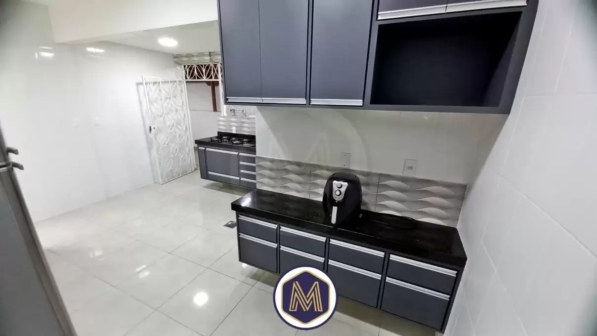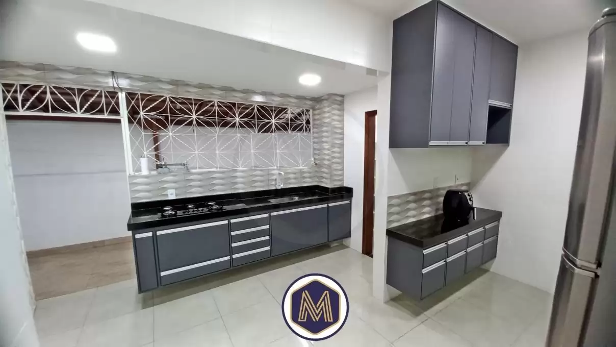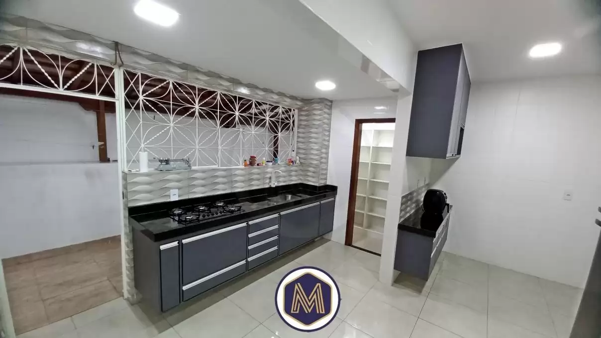 Ampla cozinha com 2 ambientes, armrios planejados, bancadas em granito, cuba da pia em inox, e acesso a ampla rea privativa em  U  e lavanderia